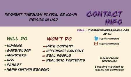 You/Your: The individual purchasing the Commission.1. Making Orders- I reserve the right to decline any commission request without question.- I reserve the right to adjust pricing on a requested piece accordingly before purchase.- On the request of NSFW pieces you must confirm that you are over 18 years of age. If you are not over 18 years of age I reserve the right to decline and/or cease the commission, any payment already received is non-refundable.- When purchasing a commission you will receive a digital full resolution version of the artwork. No shipping is required.- Your personal information will not be distributed to third parties and only required for purpose of the commission.2. Payment- Payment is done via Paypal invoice or Ko-Fi transaction, and is in AUD.- I will not begin the piece until I receive payment. For full body coloured and painted pieces a wip update will be given prior to payment, once confirmation on the piece is given and payment received the piece will be completed.- For sketch commissions full payment must be provided before I start working on the commission.3. Edits and changes- For full body coloured commissions I will show you sketch and ask if there's is anything you'd like to change. I cannot redraw the whole picture, only edit.- Small adjustments can be made on completed commissions. Large changes will incur an additional fee.4. Use of the Commission- I reserve the right to include any commission completed under this agreement in my portfolio in all its forms. I reserve the right to post on my social media unless requested otherwise.- I own the copyrights of the artwork. The characters will hold the copyright of the original creator/owner.- Prices listed anywhere or stated under this agreement are for personal use only. There is no transfer of rights from me to you under this agreement.- You may not use or publish for commercial use. You may not use the artwork for training A.I's or for NFTs.- You can post commissions with appropriate credit.*5. Cancellation and Refunds- All commission work is non-refundable.- I reserve the right to cancel the commission at any time. If I decide to cancel Your commission, You will receive a full refund.- For full body commissions and painting, if cancellation of the commission occurs at the sketch phase a partial refund can be made.If you wish to negotiate terms for a commercial agreement (including limiting distribution or publication) or an agreement contrary to these terms, please contact me at: [email protected]. Agreements to limit my distribution and publication of a work must be made before the commission is ordered.All commissions are presumed personal and in line with this ToS unless otherwise agreed upon in writing.